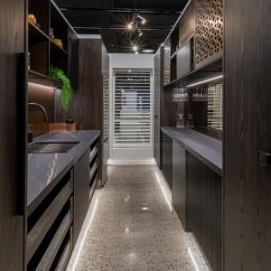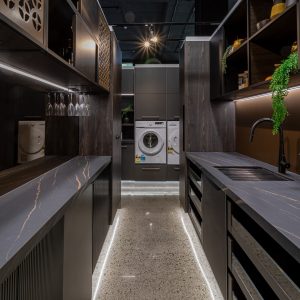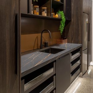The Innovative Kitchens showroom in Parnell delivers an immersive experience crafted to inspire anyone looking for a design and manufacturing partner for their kitchen project. Designed by award winning kitchen designer Lisa Thesing, the showroom showcases two distinct yet complementary design themes: one rooted in classic architectural elegance with warm tones and traditional detailing, and the other driven by bold metallics, strong contrasts and textured matte finishes. Key fixtures include a spacious island for preparation and entertaining, alongside a scullery and integrated appliances engineered for functional luxury. Materials on display include porcelain benchtops that replicate natural stone, warm wood veneers, rich matte lacquers and metallic finishes — reflecting current trends and high-end living.