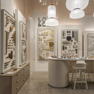 The Lo & Co Interiors showroom at Residium is an immersive design space curated to highlight luxury architectural hardware in context. Thoughtfully designed by the team at Material Creative, this beautiful hardware boutique environment presents handles, pulls, knobs and doorware as the refined finishing-touch elements they truly are – positioned as the “crowning jewels” of refined cabinetry.
